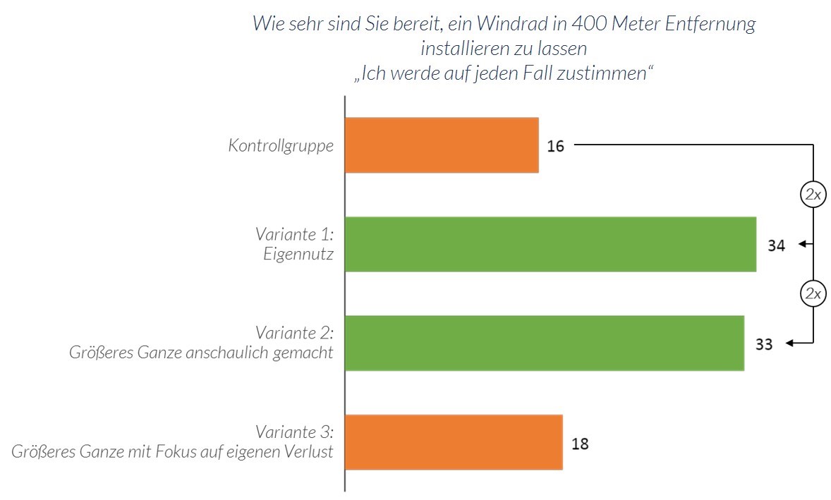 Meine Studie zeigt die Effekte an einem konkreten Beispiel: Ein Appell an die Demut, in dem Fall an das größere Ganze, erhöht messbar die Bereitschaft, dem Bau von Windrädern zuzustimmen. Im Vergleich zur Kontrollgruppe sind Menschen, die eine erweiterte Perspektive annehmen, doppelt so willig, auf jeden Fall dem Bau zuzustimmen. Weitere Unterstützer können dazugewonnen werden, wenn der Nutzen dieses Eingriffs für die zukünftige Generation klar gemacht wird. Neben dem größeren Ganzen spielt auch finanzieller Eigennutz eine große Rolle.